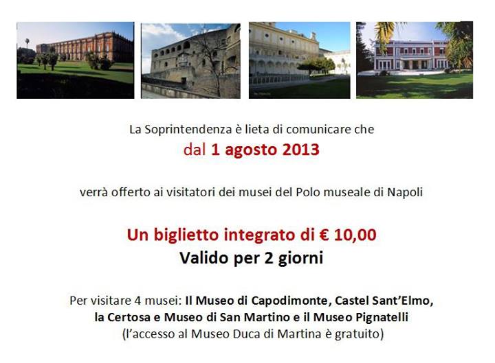 Dal 1 agosto 2013 verrà offerto ai visitatori del musei del Polo Museale di Napoli un biglietto integrato di € 10,00 valido per 2 giorni.