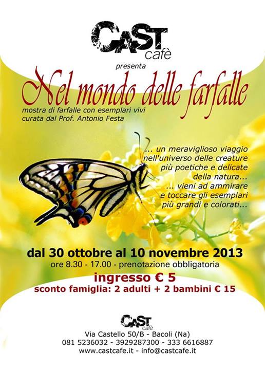 A 3 anni dalla sua prima inaugurazione, dopo almeno 20 esposizioni in altrettante location del Sud Italia e 100mila presenze, arriva a Bacoli al Cast Cafè di via Castello (di fronte al magnifico Castello di Baia) la mostra “Nel mondo delle farfalle” ideata e realizzata dallo studioso e appassionato Antonio Festa.