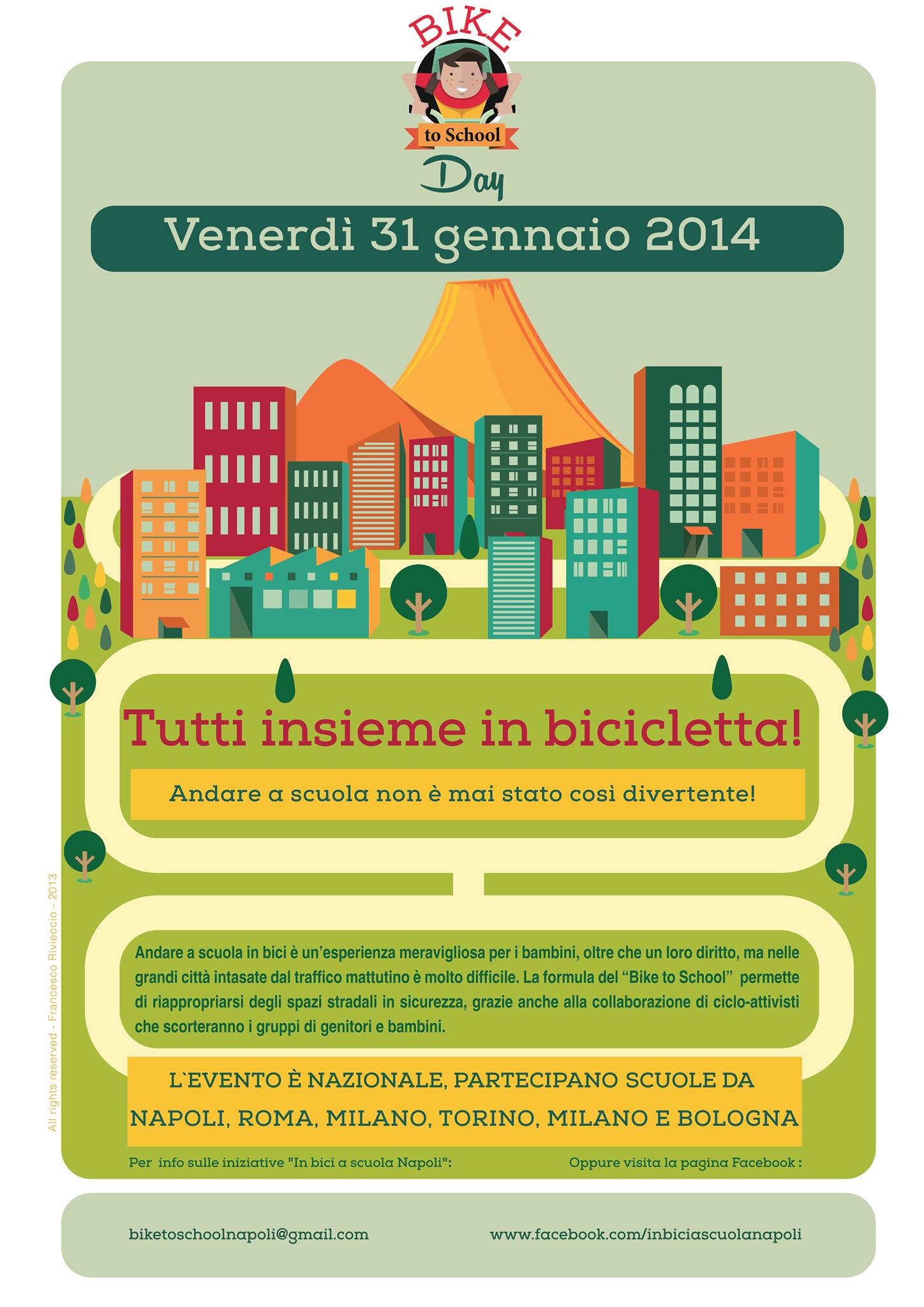 Torna venerdì 31 gennaio 2014 l’appuntamento nazionale dei genitori che in tutta Italia (Napoli, Roma, Milano, Torino e Bologna) accompagnano i loro figli in bicicletta a scuola. Vuoi partecipare anche tu al Bike-to-School? è semplice, basta contattare la pagina In Bici a scuola Napoli o i numeri di Francesco 3493602695 e Renato 3388744100 . Basterà scegliere un luogo per l’appuntamento, decidere un itinerario da percorrere, imparare la migliore modalità per garantire la sicurezza dei pargoli in bici su strada (soprattutto per i percorsi fuori dalla pista ciclabile) sia a livello di visibilità (pettorine catarifrangenti e/o lucine) sia come “formazione-squadra” (in genere gli adulti pedalano alla sinistra e avanti e dietro rispetto al gruppo di marmocchi). Poi si prepara una locandina (con l’aiuto dei ragazzi della pagina facebook), con orari e luoghi di partenza e possibilmente un riferimento mail o tel. per gli altri genitori interessati).