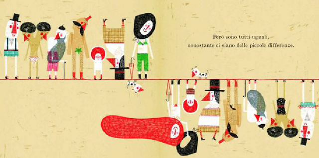 Un libro questo che si diverte a giocare con gli opposti, le forme, la ricerca dell’ uguale e della diversità, suggerendo situazioni di confronto e non “La primavera entra da una parte e spinge l’autunno dall’altra” fino all’epilogo in cui svanisce la linea rossa che separa pagina e abitanti.