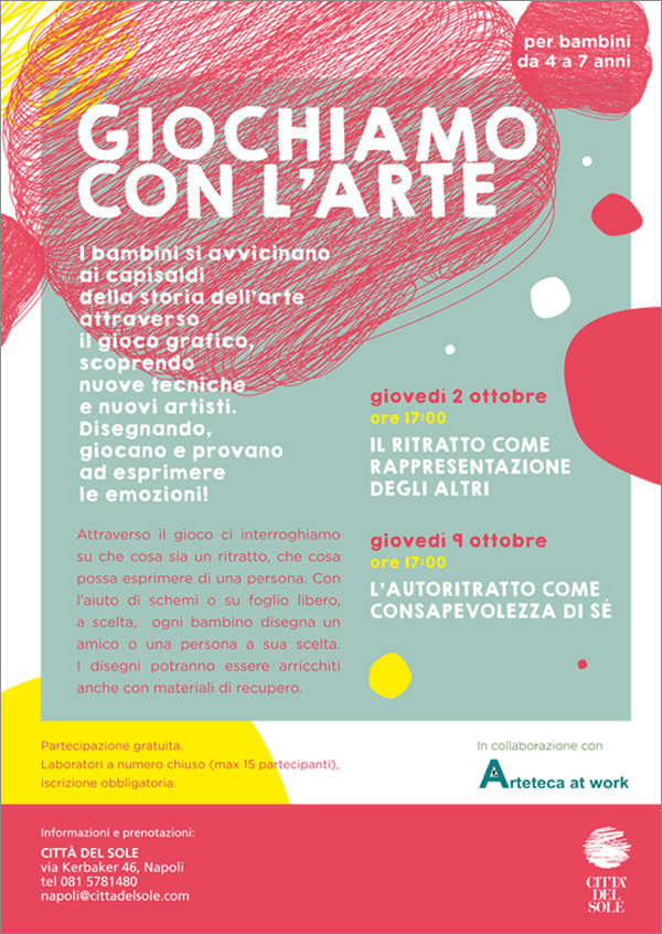 Si tratta dei primi incontri di una serie organizzata da Arteteca at work a Città del sole; i bambini si avvicinano ad alcuni capisaldi della storia dell’arte attraverso il gioco grafico: ritratto, autoritratto colori, paesaggio etc..