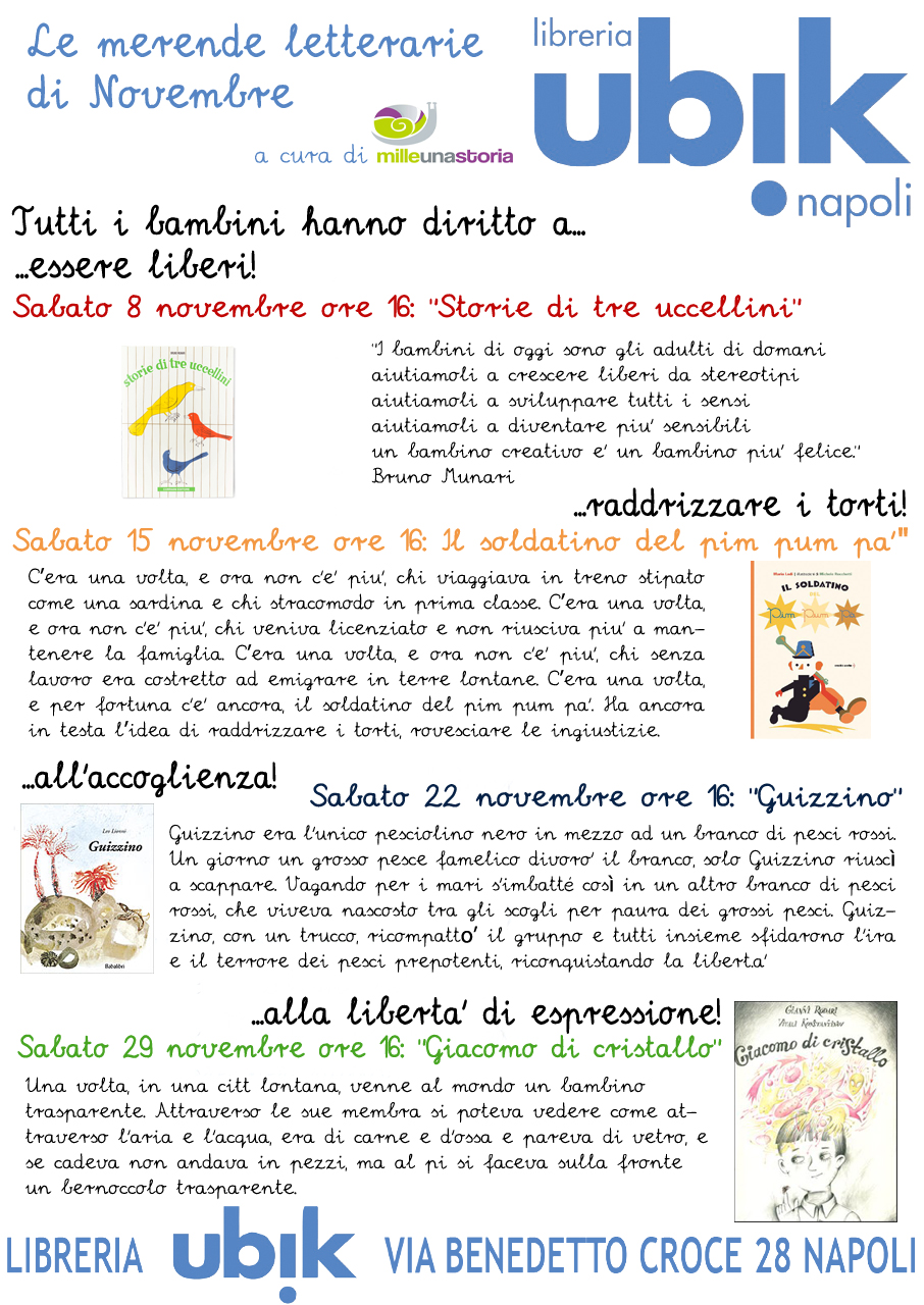 Al piano ammezzato della Libreria Ubik le magnifiche lettrici di Milleunastoria aspettano i bimbi per avvicinarli al tema dei diritti, filo conduttore delle letture di questo mese.