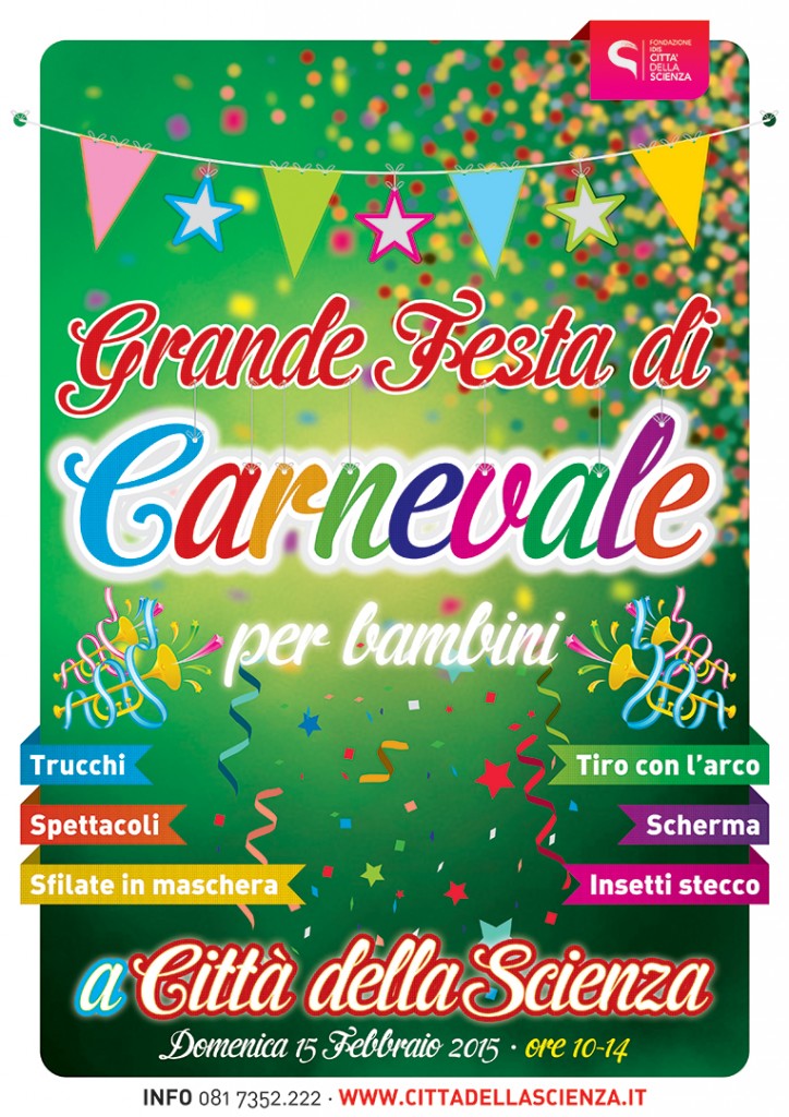 A Città della Scienza si prepara una Grande Festa di Carnevale in programma domenica 15 febbraio 2015 dalle ore 10 alle 14. Grandi spettacoli sull’interpretazione delle maschere partenopee a cura di Ole e Ilvia, sfilate in maschera, trucchi, insetti stecco e mimetismo della natura, tiro con l’arco e scherma.