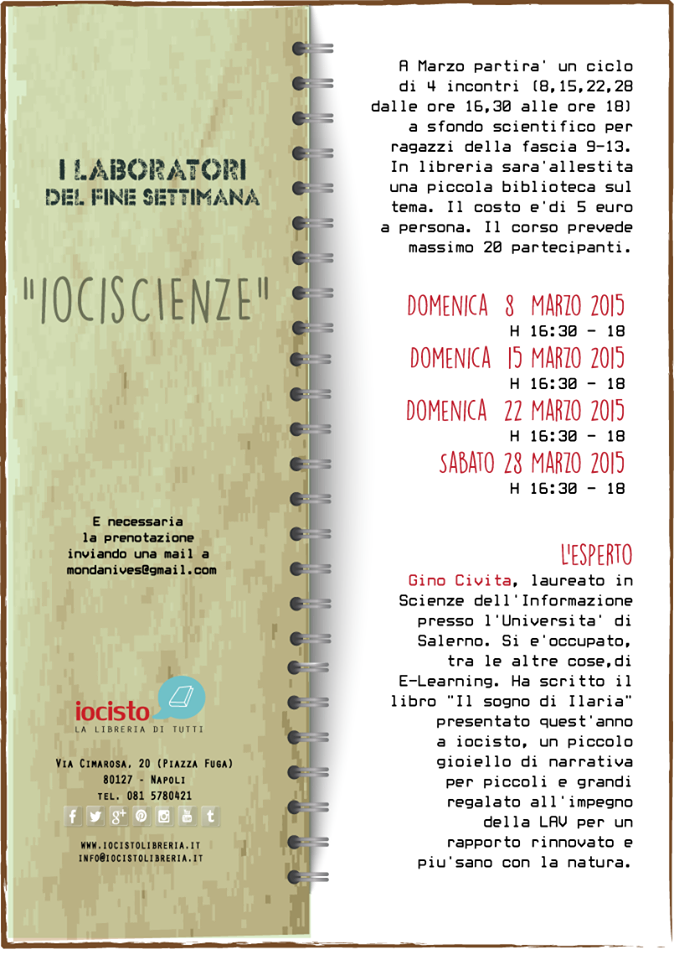 A iocisto #lalibreriaditutti la scienza è divertente! Via Cimarosa 20 (Piazza Fuga) La domenica, per ragazzi della fascia 9-13, si articolerà in 4 incontri: l’8, il 15, il 22 e il 28 marzo dalle 16,30 alle 17,45. In libreria sarà allestita una piccola biblioteca sul tema. Il costo è di 5 euro a persona.