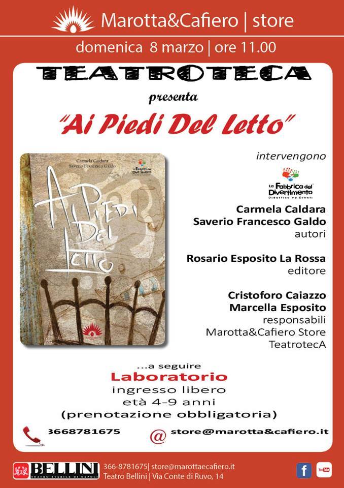 “Ai piedi del letto”, domenica 8 marzo al Teatro Bellini. Libro e laboratorio (4-9 anni). *** Perché del buio sotto le coperte non ho paura e del buio nella stanza sì? Cosa abiterà il buio? Quali mostri lo frequentano? Avrò mai la possibilità di conoscerli? Ecco le domande che bazzicano nella testa del piccolo Luigino, che grazie ai consigli della mamma e a una magica ricetta della sua bisnonna giunta fino a lui, riuscirà ad incontrare mostri strani e bizzarri pronti a giocare con lui in cambio di biscotti. L’ingresso è gratuito. Prenotazione obbligatoria 3668781675 store@marotta&cafiero.it