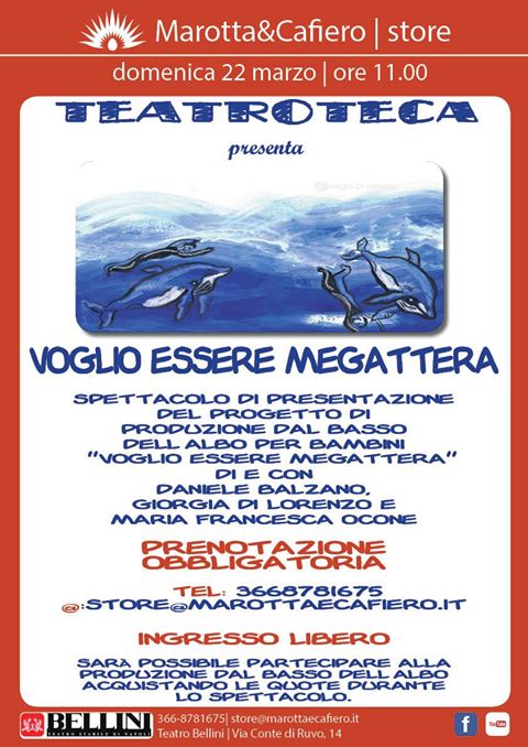 Domenica 22 marzo alle ore 11, all’interno del Marotta&Cafiero store, Teatro Bellini, laboratorio su “Voglio essere megattera” con Daniele Balzano, Giorgia Di Lorenzo e Maria Francesca Ocone. Ingresso gratuito, prenotazione obbligatoria: 3668781675 store@marottaecafiero.it