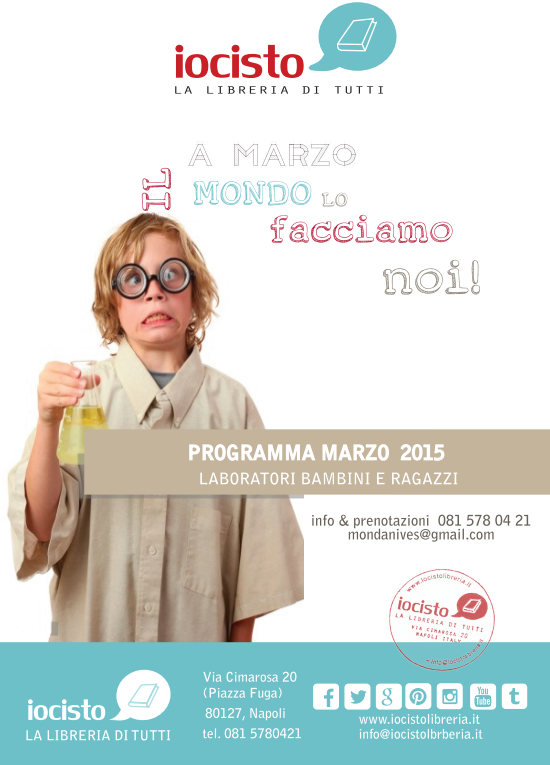 A iocisto #lalibreriaditutti la scienza è divertente! Via Cimarosa 20 (Piazza Fuga) La domenica, per ragazzi della fascia 9-13, si articolerà in 4 incontri: l’8, il 15, il 22 e il 28 marzo dalle 16,30 alle 17,45. In libreria sarà allestita una piccola biblioteca sul tema. Il costo è di 5 euro a persona.