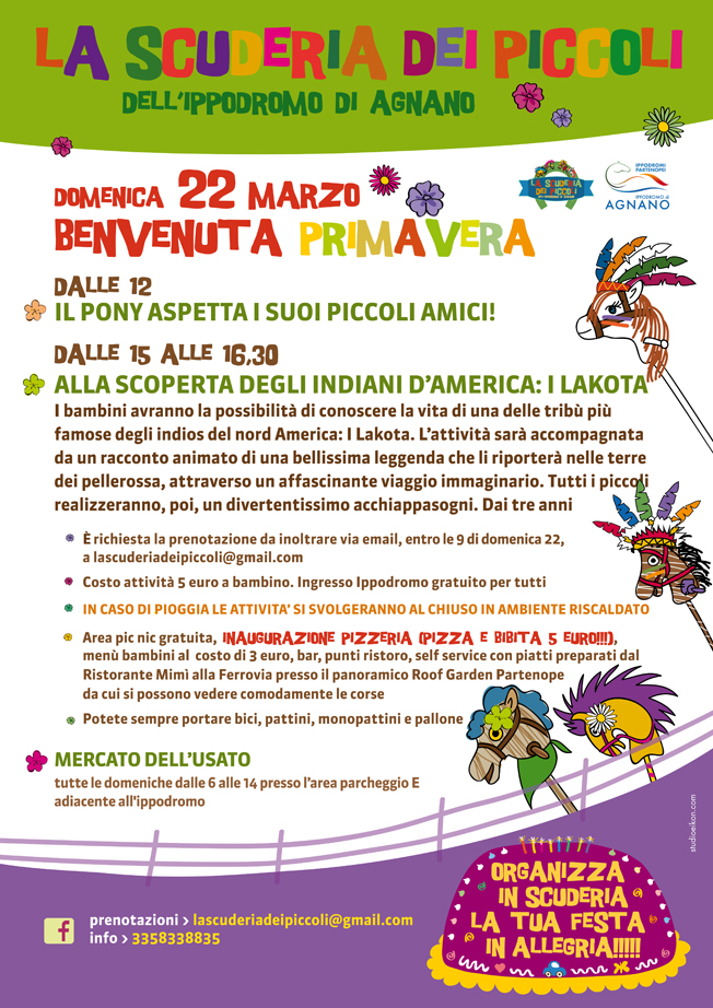 ORE 12 IL PONY ASPETTA I SUOI PICCOLI AMICI! ORE 15-16.30 ALLA SCOPERTA DEGLI INDIANI D’AMERICA: I LAKOTA I bambini avranno la possibilità di conoscere la vita di una delle tribù più famose degli indios del nord America: I Lakota. L’attività sarà accompagnata da un racconto animato di una bellissima leggenda che li riporterà nelle fantastiche terre dei pellerossa, attraverso un affascinante viaggio immaginario. Tutti i piccoli realizzeranno, poi, un divertentissimo acchiappasogni. Richiesta la prenotazione da inoltrare via email a: lascuderiadeipiccoli@gmail.com entro le 9 di domenica 22 Costo: 5 euro/bambino