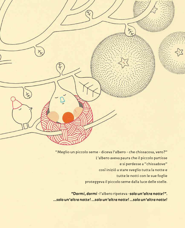 E per prendere la strada e andare a fiorire a nord, a sud, a Chissadove. Ma un piccolo seme rimane silenzioso sull’albero e l’albero si convince a tenerlo con sé, a proteggerlo, a rimandare la partenza al giorno migliore, che – inevitabilmente – è sempre quello che verrà. Un giorno però una gazza frettolosa fa sì che il piccolo seme lasci l’albero e incominci un suo viaggio, la cui metà non è poi così distante, ma dove cresce un progetto tutto suo.
