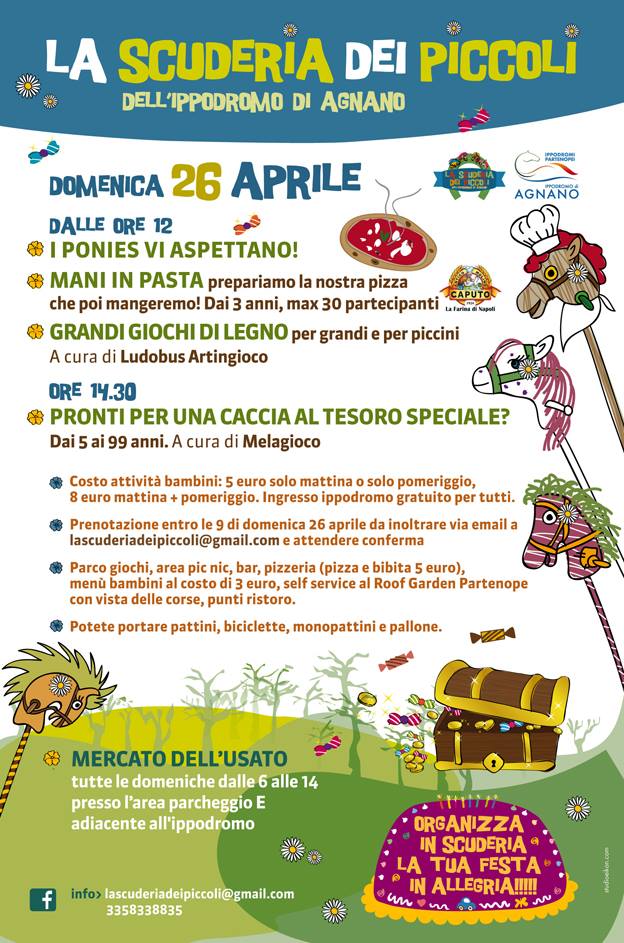 DALLE ORE 12 TUTTI IN SELLA AL PONY, a seguire MANI IN PASTA: Prepariamo la nostra pizza! (per l’attività dell’impasto i bambini mangeranno la pizza fatta da loro + bibita, incluso nel costo attività) Grandi Giochi di Legno di Ludobus Artingioco ORE 14,30 Caccia al Tesoro Speciale a cura di Melagioco. Costo attività bambini: 5 euro solo mattina o solo pomeriggio, mattina+pomeriggio 8 euro. Ingresso ippodromo gratuito per tutti. Parco giochi, bar, pizzeria (pizza e bibita 5 euro), menù bambini al costo di 3 euro, self service al Roof Garden Partenope con vista delle corse, punti ristoro. Potete portare pattini, biciclette, monopattini e pallone. Tutte le domeniche mercato dell’usato nell’area parcheggio “E” adiacente all’ippodromo. Per info 3358338835 – è richiesta la prenotazione da inoltrare via email a lascuderiadeipiccoli@gmail.com entro le 9 di domenica 26 APRILE attendendo email di conferma.