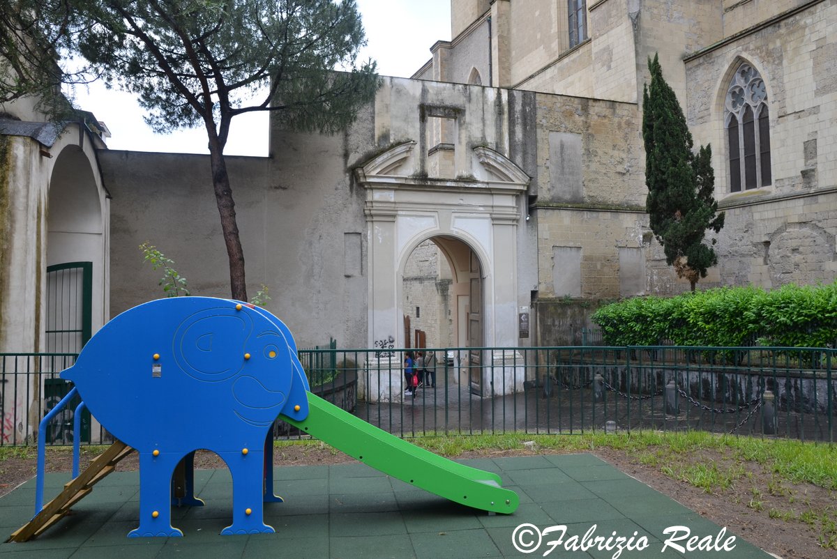 Uno spazio verde, recintato, dedicato ai bambini in età prescolare è di per sè qualcosa di non frequente in una città come Napoli. Che quello inaugurato oggi sia in pieno centro antico, lungo il decumano inferiore, all’interno del cortile di Santa Chiara è qualcosa di impensato fino a qualche anno fa. Per chi non sia della zona, in un luogo dove normalmente genitori e nonni son soliti portare i bimbi piccoli a “prendere aria” nei chiostri monumentali, a San Marcellino e Festo o Santa Chiara, i giardinetti di Santa Chiara aperti ai bambini costituiscono una piccola rivoluzione. Sono stati inaugurati oggi dal presidente della seconda municipalità di Napoli, contestualmente all’installazione di un presidio dei vigili urbani proprio a metà fra Santa Chiara e Gesù Nuovo (ne ho parlato sul mio blog Diario Napoletano) e sono stati strutturati per far divertire i bambini che frequentano le materne: altalene con protezione, uno scivolo a forma di elefante, un castelletto con scivolo non troppo alto, una casetta e qualche altro gioco sparso qua e là, in mezzo ad aiuole fiorite e sentieri. Fra qualche tempo ci sarà anche il prato, appena seminato.