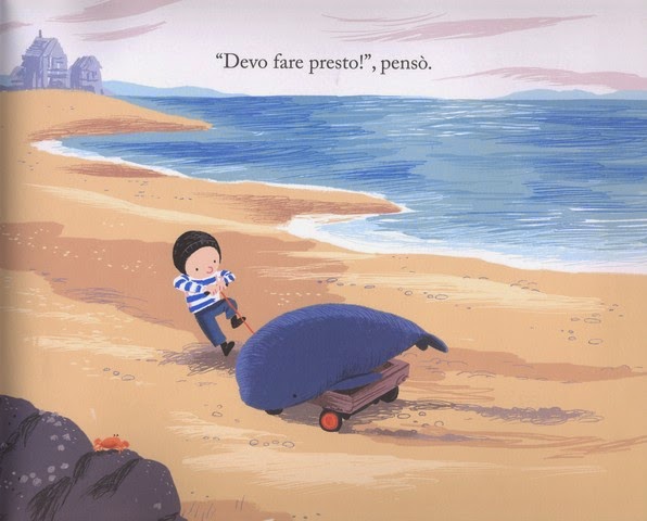 E poi mantenere il segreto anche a cena, camminare in punta di piedi per portarle cibo per non essere scoperto dal babbo che insieme si rende conto di essere tanto assente e si china verso il figlio per spiegare che è il mare il posto adatto alla balena.