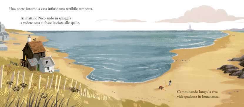 Sulla copertina di questo albo ci sono una balena arenata e un bambino che si guardano un po’ persi, dopo la tempesta che ha lasciato sulla spiaggia quell’insolito regalo;