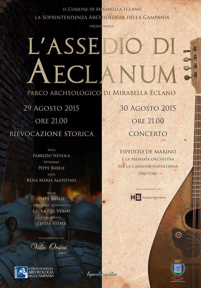 Il 29 agosto alle ore 21.00, presso il Parco archeologico di Mirabella Eclano, a poco piú di un’ora di auto da Napoli, si terrá una rievocazione storica (narrata da tre attori: Silla, Petronio e Livia) della battaglia di Aeclanum.