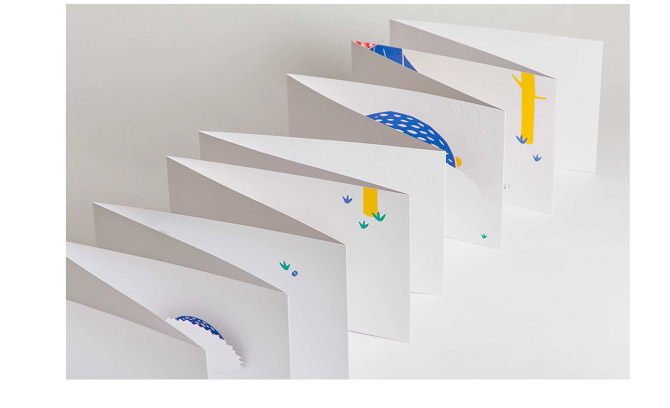 Ogni traccia è una goffratura a rilievo nella pagina, ogni aletta copre una piccola illustrazione-sorpresa colorata.