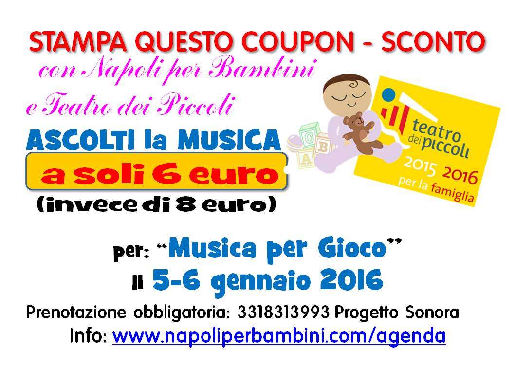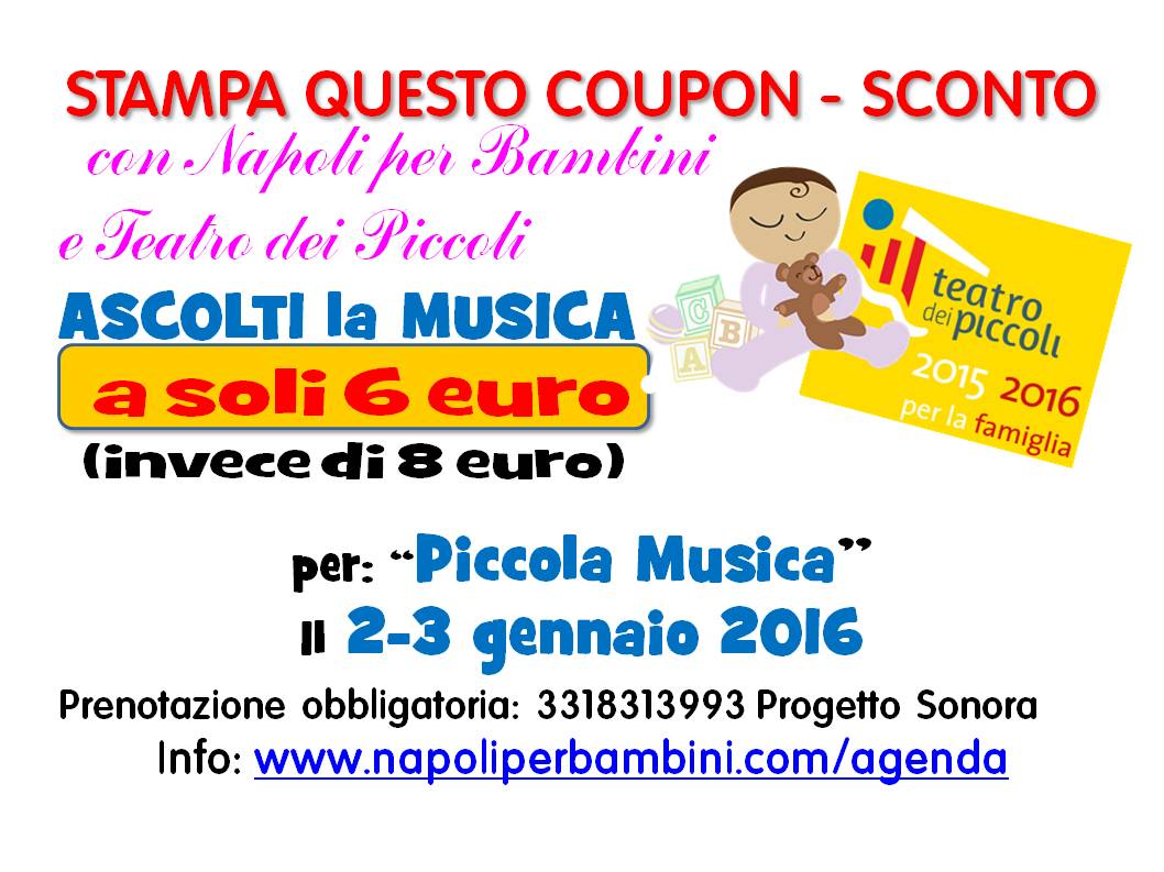 Anche la musica arriva con il coupon: gli spettacoli del “Teatro dei Piccoli” della domenica mattina (adatti dai 3 anni in su), cioé la Piccola Musica ( 2 e 3 gennaio) e la Musica per gioco ( 5 e 6 gennaio) saranno ancora più economici se stampi questi due coupon e li presenti alla cassa (ma non dimenticare di prenotare a Progetto Sonora 331 8313993 ).