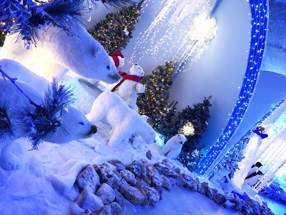 All’ingresso, dopo una grande luminaria, ci sono delle cassette di sicurezza per lasciare borse e buste, poi si comincia il percorso: praticamente tutto quello che vedrete è in vendita (sono vietate le foto!). Ci sono degli animaletti e dei soggetti natalizi in movimento e poi la stanza di Babbo Natale, dove è possibile fare una foto con lui (7 € una foto, 2 per 10 €). Si prosegue attraverso abeti di vario tipo per giungere alla zona presepi, ci sono anche molte giostre carillon esposte con soggetti in movimento, ma di tipo moderno, ad es. il piccolo luna park, i pattinatori, il trenino. Molto affascinanti per i bambini! Solo peccato che i piccoli devono essere presi in braccio per vederli bene (la mia schiena ringrazia…). Poi una stanza tutta allestita natalizia, con un Babbo Natale che canta e balla e un grande albero di Natale. A seguire una sala tutta bianca e luccichii, molto di impatto (vedi foto presa da FB), con eschimesi in movimento, orsi polari giganti e una specie di Elsa di Frozen. Seguono oggetti per la casa, palline e decorazioni. Secondo me ci sono addobbi un po’particolari, non certo da mercatino. Siamo riusciti a permetterci qualcosa solo al reparto outlet