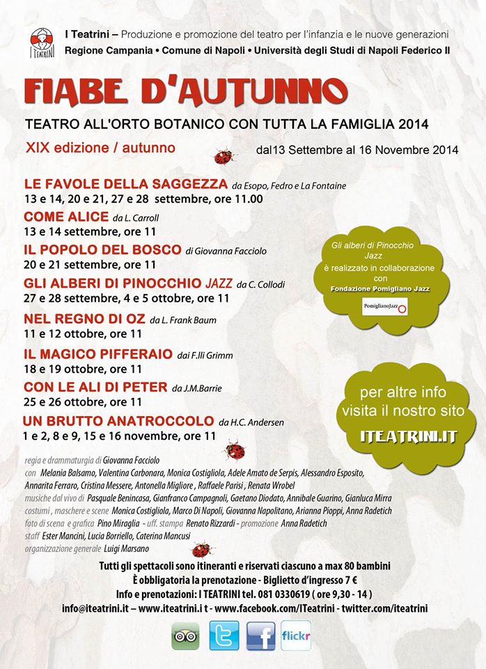 Ritornano I Teatrini, un appuntamento in cui la fantasia prende forma nei personaggi del teatro, in modo creativo, educativo e mai banale, non solo per i bimbi quindi, ma per tutta la famiglia: ci siamo stati l’anno scorso a Villa Pignatelli e Luigi ci ha raccontato come nascono “I Teatrini”. Ora è il momento per andare all’Orto Botanico alle “FIABE D’AUTUNNO”, sabato e domenica (ore 11,00).