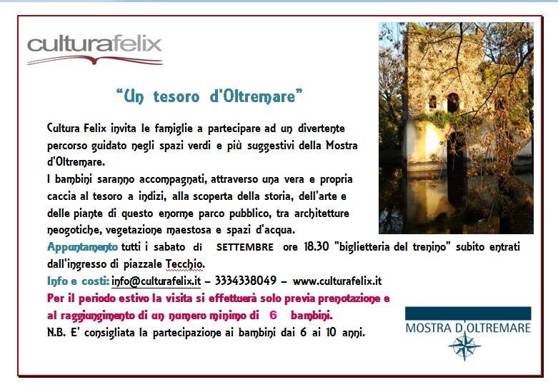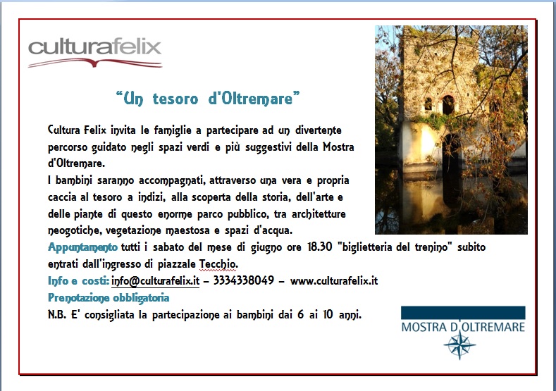 Una divertente e istruttiva caccia al tesoro per bambini è quella che propone tutti i sabato di settembre (su prenotazione) “Un tesoro d’Oltremare”, di Cultura Felix alla Mostra d’Oltremare.